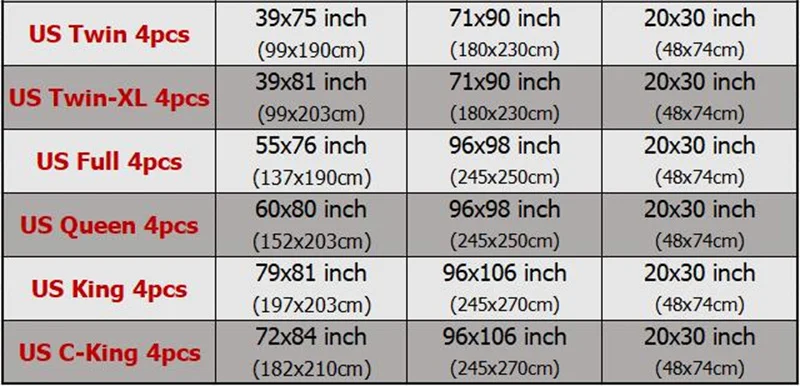 Twin Size 4pcs, Single Size 4pcs, US C-King 4pcs, US Queen 4pcs, US King 4pcs, US Twin-XL 4pcs, US Full 4pcs, King Size 6pcs, US Twin 4pcs, Queen Size 4pcs, Queen Size 6pcs, King Size 4pcs, Full-XL Size 4pcs, Double Size 4pcs, Twin-XL Size 4pcs, Full Size 4pcs
